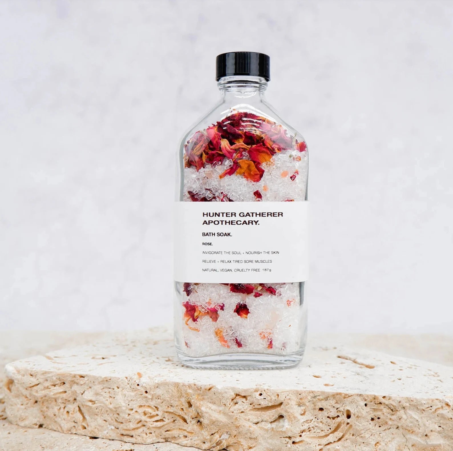 Rose. Dried Rose Petals, Pink Himalayan Salt, Magnesium Epsom Salt, Patchouli, Rose Geranium and Lime Essential Oils.