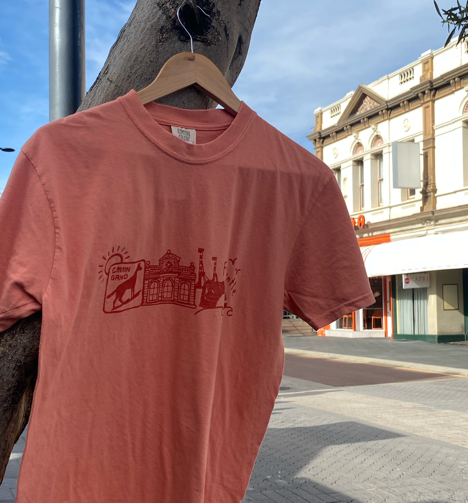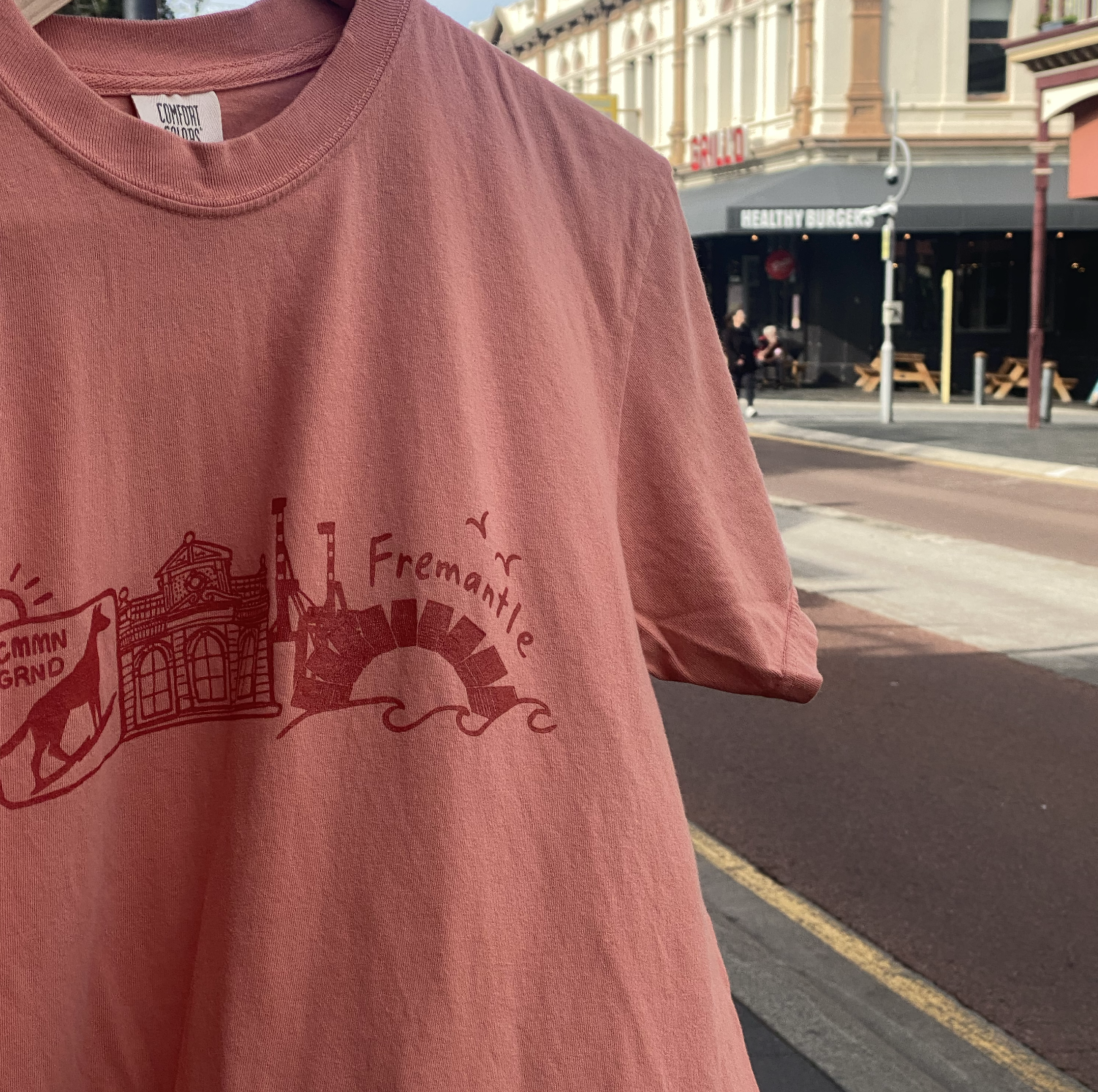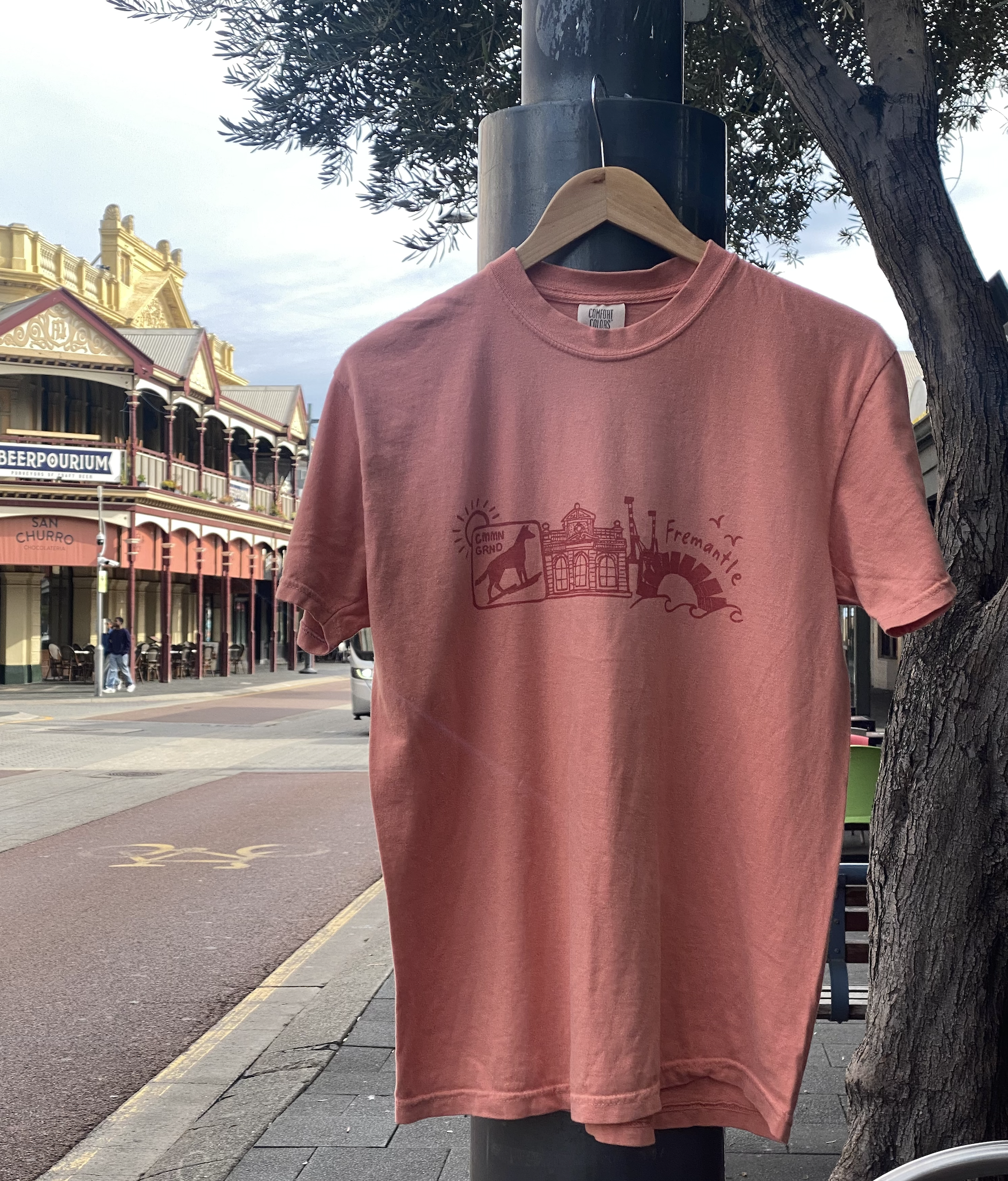 Inspired by Freo's skylines this warm red print on a 100% cotton terracotta tee is perfect for a sunny day out in town.